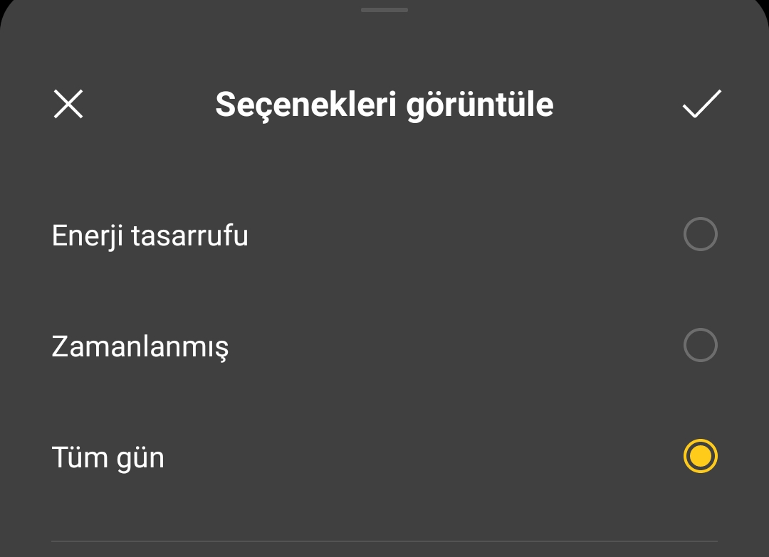 Yazımda dikkat ederseniz "Tüm gün" açık olmasına rağmen dedimSeçeneklerden "Enerji Tasarrufu"nu Tüm Gün olarak değiştirin.